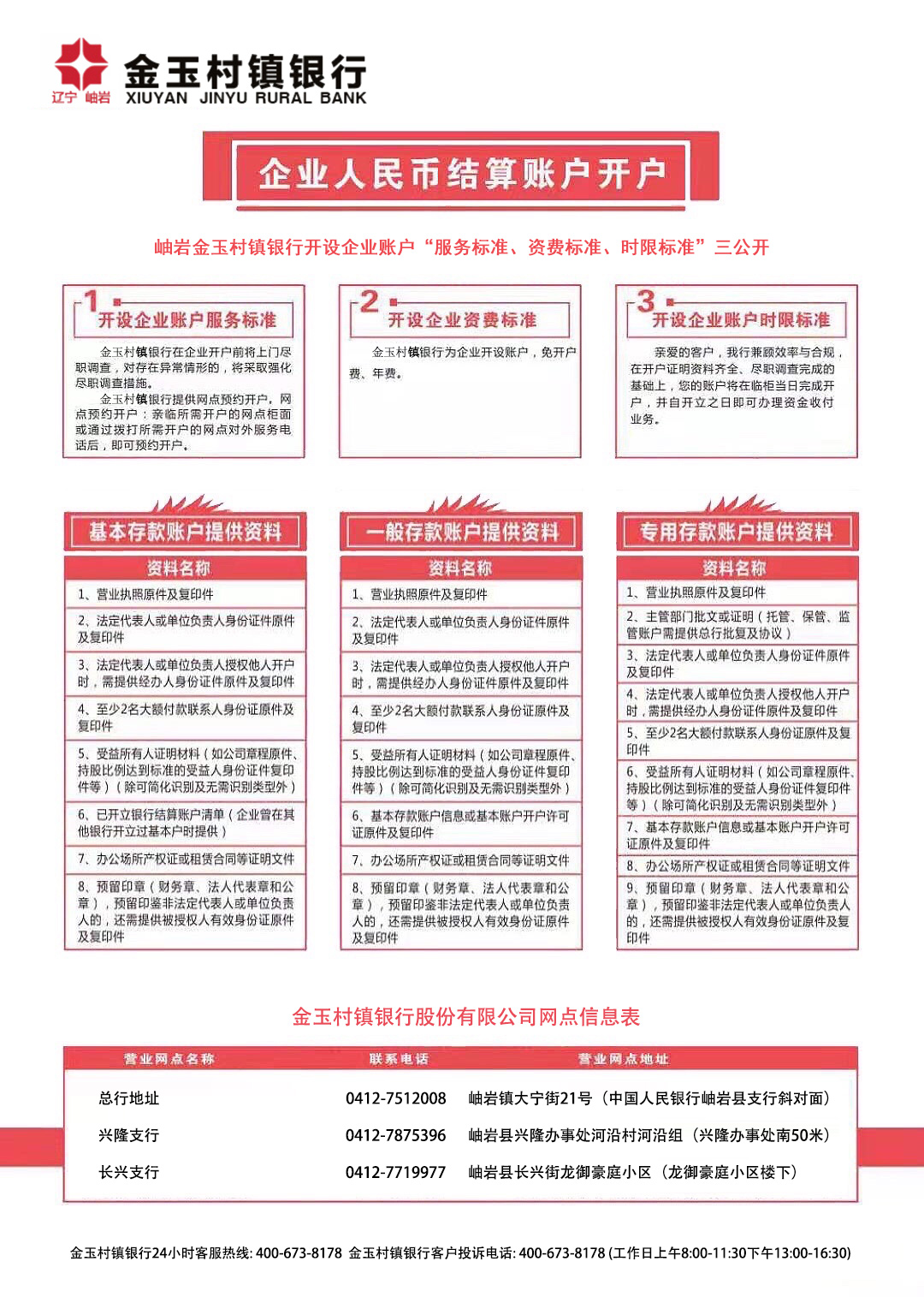 岫巖金玉村鎮(zhèn)銀行開(kāi)設(shè)企業(yè)賬戶“服務(wù)標(biāo)準(zhǔn)、資費(fèi)標(biāo)準(zhǔn)、時(shí)限標(biāo)準(zhǔn)”三公開(kāi)
